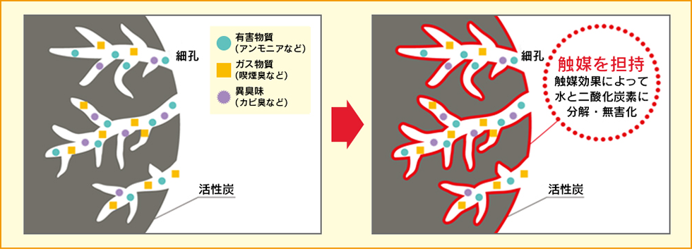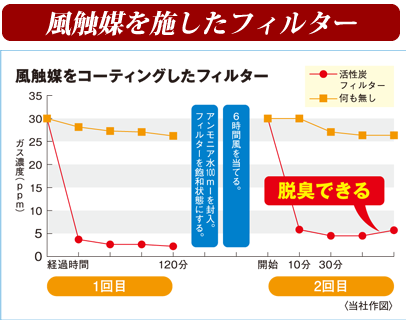 一般的な活性炭フィルターは、吸着した物質で目詰まりを起こすと脱臭効果は著しく低下しますが、フルポイントの活性炭フィルターは触媒を担持させることにより、吸着した物質を分解し、フィルターの脱臭能力を再生します。この流れを繰り返すことでフィルターの寿命を大幅に伸ばします。