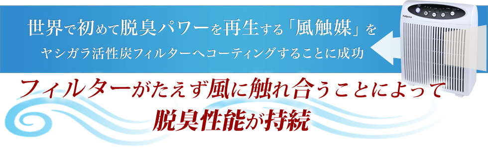 Fullpointは世界で初めて"風触媒"を搭載した空気清浄機です。風触媒を活性炭フィルターに付着状態にさせることでフィルターの寿命を大幅に伸ばし、脱臭効果が何度も復活します。