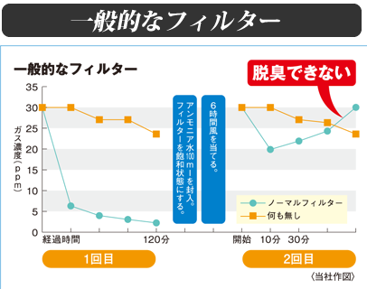 一般的な活性炭フィルターは、吸着した物質で目詰まりを起こすと脱臭効果は著しく低下しますが、フルポイントの活性炭フィルターは触媒を担持させることにより、吸着した物質を分解し、フィルターの脱臭能力を再生します。この流れを繰り返すことでフィルターの寿命を大幅に伸ばします。